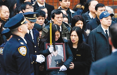 4日,全美各地的两万多名警察和民众聚集纽约,送别2014年底遭枪杀的纽约华裔警察刘文健。按照警方的说法,刘文健的葬礼是纽约市警局历史上最大规模的葬礼之一。