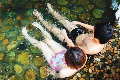 游客在保亭七仙岭君澜度假酒店享受温泉鱼疗。 本报记者 王凯 摄