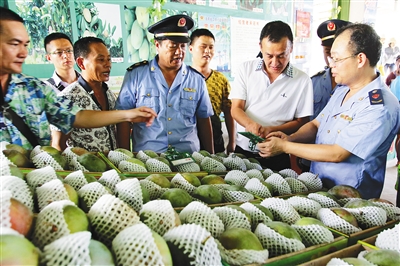 三亚工商开展国庆黄金周节前联合整治行动。图为工商人员正在对水果店进行检查。 本报记者 武威 通讯员 林建喜 摄