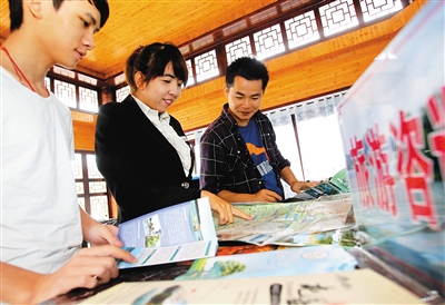 ⬅在屯昌县游客到访服务中心,工作人员热情地为游客提供咨询服务。 本报记者 陈元才 摄
