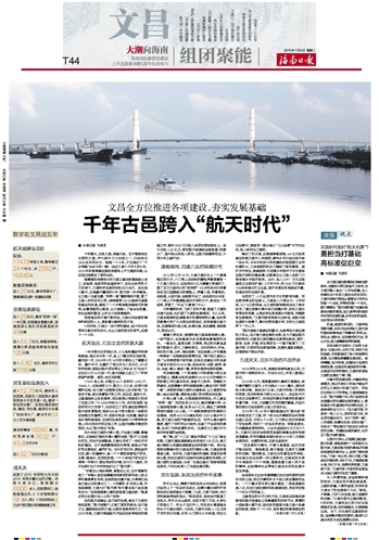 随着国际旅游岛元年文昌卫星发射基地破土动工,在省委、省政府的坚强领导下,在社会各界的大力支持下,文昌科学发展的车轮马力全开。在当地人眼中,这是翻天覆地的5年:航天城一步步崛起,让文昌人充满自豪;“两桥一路”横跨海峡天堑,圆了文昌人民的百年之梦;滨湾路等120公里城市道路的建设和改造,搭起了一个中等滨海旅游城市的框架;纵横穿越的公路网,让文昌融入了省会生活圈;民生设施的推进,让侨乡大地春意盎然。