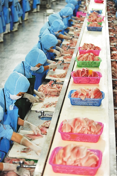 ⬅ 定安共有罗非鱼养殖面积1.9万亩,年产量6500吨。其中,很多经深加工后销往国外。 本报记者 王凯 特约记者 傅林 摄