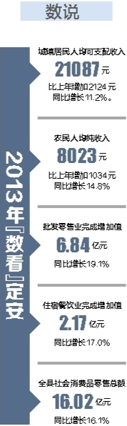 围绕“农业增效,农民增收”目标,定安不断加快农业产业化进程,大力发展特色产业,按照“打造3个农产品示范基地、3个农业品牌、3个专业合作社、3家农家乐”的“四个三”行动,促进农业的跨越式发展,农民增收效果显著:2013年定安农民人均纯收入首次突破8000元大关,2014年上半年,农民人均可支配收入4780元,同比增长13.1%。