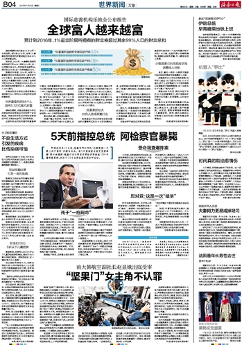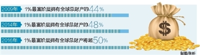 国际慈善机构乐施会19日公布一份报告称,预计到2016年,全球1%最富阶层所拥有的财富将超过其余99%人口的财富总和。报告说,2009年,1%最富阶层拥有全球总财产的44%,而到2014年,这一比例增长至48%,按照现有发展势头,预计到2016年,这一比例将超过50%。