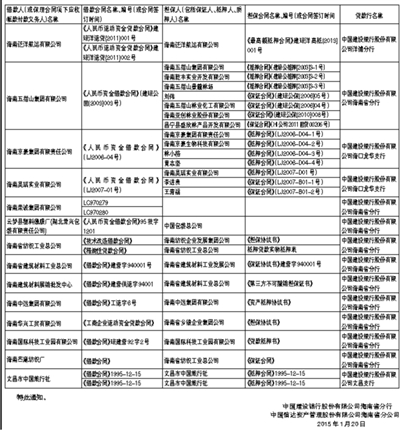 2014年12月12日,中国建设银行股份有限公司海南省分行(以下简称“建行”)与中国信达资产管理股份有限公司海南省分公司(以下简称“信达”)签署《资产转让合同》,建行将其依法享有的下列公告清单中所列借款人及其担保人享有的主债权及担保合同项下的全部权利依法转让给信达。建行现以公告方式通知债务人和担保人。请借款人和相应担保人或借款人、担保人的承继人向信达履行还款义务(若借款人、担保人因各种原因发生更名、改制、歇业、吊销营业执照或者丧失民事主体资格等情形,请相关承债主体、清算主体代为履行义务或者承担清算责任)。