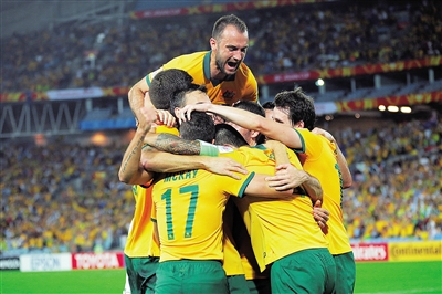 澳大利亚队以4比0战胜阿曼队。图为澳大利亚队球员庆祝得分。 (本栏照片均由新华社发)