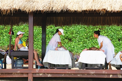 俄罗斯游客正在三亚海边享受中医按摩。 本报记者 王凯 摄