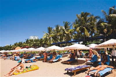 三亚大东海边,大量俄罗斯客人在沙滩上享受着北纬18度的艳阳。本报记者 张杰 摄