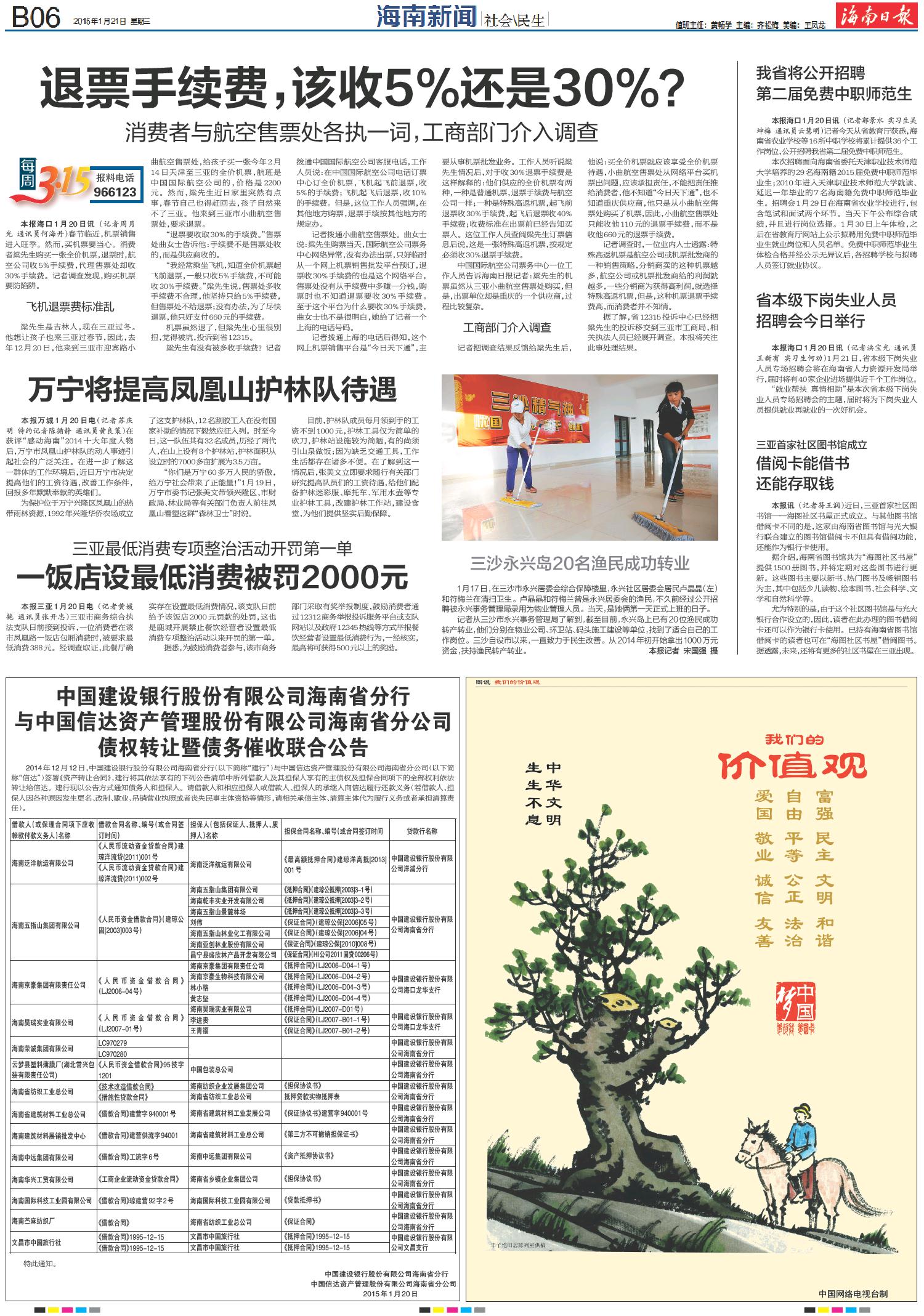 中国建设银行股份有限公司海南省分行与中国信达资产管理股份有限公司海南省分公司债权转让暨债务催收联合公告
