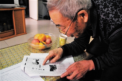 1月23日,呼格吉勒图父亲李三仁通过当年的新闻报道查看办案人员信息。 新华社记者 刘懿德 摄