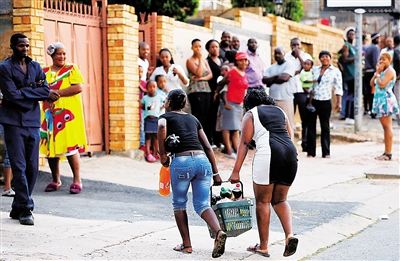 1月22日,在南非约翰内斯堡市的黑人城镇索韦托,两名女子提着装满商品的购物篮跑出一家店铺。 南非约翰内斯堡市一城镇发生的针对外国人的骚乱23日持续升级,迄今已导致2人死亡。骚乱发生在约翰内斯堡市的黑人城镇索韦托。