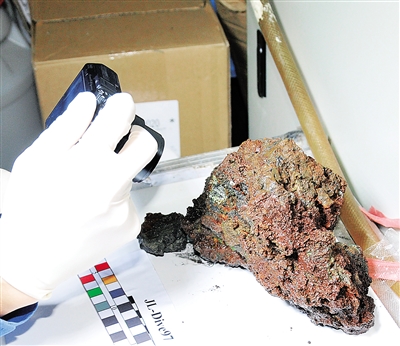这是“蛟龙”号载人潜水器采集到的硫化物(1月29日摄)。 当日,中国载人潜水器“蛟龙”号在西南印度洋执行2014-2015年试验性应用航次(中国大洋35航次)第三航段首次下潜。“蛟龙”号在龙旂热液区采集硫化物和烟囱样品。
