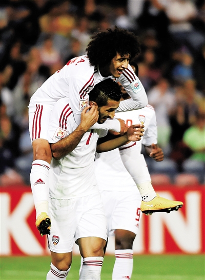 在30日进行的2015年亚洲杯三四名决赛中,阿联酋队与伊拉克队上演了一场进球大战,结果阿联酋队以3:2胜出,获得季军。图为阿联酋队队员庆祝进球。