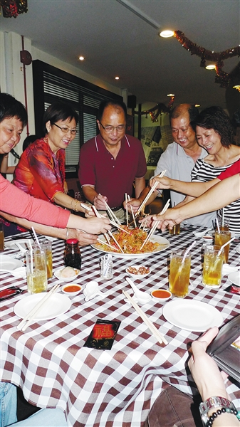 过年捞“鱼生”,是新加坡琼侨很惬意的事情。 谢向荣 摄