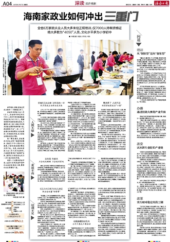 我省共有家政从业人员6万人,但经培训持证的仅7000人,而其中持有高级技能资格证的只有1000人。随着海南国际旅游岛建设发展,大量候鸟老人涌入海南,同时很多家庭也需要保姆照看小孩,家政服务行业“一老一小”日益增长的刚性需求与家政服务人员短缺的矛盾,成为家政业面临的突出问题。