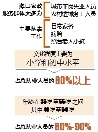据了解,目前海口市家政服务群体大多为城市下岗失业人员和农村进城务工人员,主要从事日常家务、“病陪”、照看老人小孩等服务工作。经记者调查,发现家政从业人员的文化程度主要集中在小学和初中水平,占总从业人员的80%以上,文化素质较低,年龄在35岁至55岁之间,其中40岁至50岁这个年龄段的占绝大部分,占总从业人员的80%—90%。