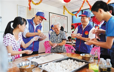 图为一些海南省注册志愿者在海口市福利院陪老人、儿童一起做汤圆。