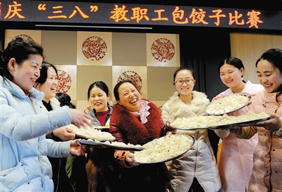 3月6日,在江苏省金湖县金荷花幼儿园食堂,女教师们展示自己包的饺子。 当日,江苏省金湖县金荷花幼儿园组织女职工在食堂开展庆“三八”包饺子趣味大赛。女职工们施展看家本领,包出寓意独特的“饺子拼盘”,庆祝属于自己的节日。 新华社发(陈义宝 摄)