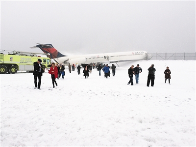 因为雪滑,美国达美航空公司的一架飞机5日在纽约拉瓜迪亚机场冲出跑道,致数人轻伤。在纽约拉瓜迪亚机场,出事客机的乘客正在疏散(见右图)。美国东部纽约州、新泽西州和康涅狄格州5日再次遭遇暴风雪。据美国航班信息网站提供的数据,截至当地时间5日上午10时40分,大纽约地区3个机场有863个航班被取消,160个航班晚点。