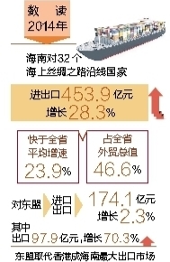 据海口海关统计,去年,海南对32个海上丝绸之路沿线国家进出口453.9亿元,增长28.3%,快于全省平均增速23.9个百分点,占全省外贸总值的46.6%。对东盟进出口174.1亿元,增长2.3%,其中出口97.9亿元,增长70.3%,东盟取代香港成海南最大出口市场。