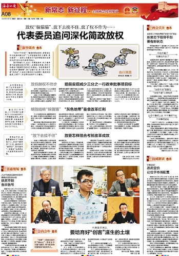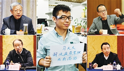 “创客”一词源自英文的“Maker”,是指出于兴趣与爱好,努力把各种创意转变为现实的人。今年全国两会的会场内外,代表委员纷纷热议“创客”、创新和创业。 中图:“创客”马天驰展示他的作品——疲劳驾驶预警眼镜。 左上:全国人大代表李景田认为,科技创新成果有很大一部分还停留在论文上、实验室里、评奖会上,不能转化成生产力,今后要加大科技创新成果的落地率,从而推动产业转型升级。 左下:全国政协委员康耀红认为,创业是提高就业水平的一个非常重要的方面,要加大力度保护知识产权。 右上:全国政协委员俞敏洪认为,鼓励和支持“创客”,首先要培育好“创客”滋生的土壤。政府应加大对“创客”一族的政策支持,减免税收或提高大学生创业贷款的额度。 右下:全国政协委员高玉葆认为,政府在扶持大学生创业方面应给予更多试错机会并建立失败补偿机制,让大学生乐于和敢于创业。新华社记者 陈晔华 毛思倩