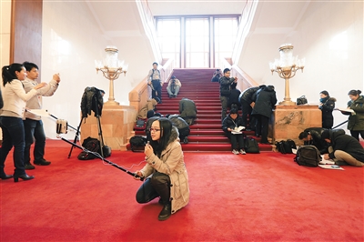 2015年两会,小小的自拍杆“火了”。会场内外,时常可见“自拍神器”的踪迹。这是3月5日,一名记者在全国政协十二届三次会议记者会上自拍。新华社发