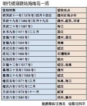 海寇始终来犯。史料记载海南的海寇活动比广东、福建一带晚了将近10年。洪武十一年(1378年)四月十四日,倭寇登岸掠劫儋州沿海村庄;洪武十九年(1386年)五月十九日,倭寇掠劫儋州新英、洋浦港货物;成化元年(1465年),海寇登澄迈县县治,民居烧毁一空;正德十二年(1517年)二月,倭寇登临高石牌、白庙等村庄,烧劫民舍;嘉靖年间,昌化守御所置巡视海面船被海盗掠走……