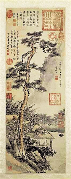 作为乾隆的五大词臣之一,钱陈群深受皇帝信赖。“沈德潜后惟钱陈群一人而已”,这是乾隆对钱陈群极高的评价。乾隆与钱陈群有着特殊的君臣之情,所以他对钱陈群所进母亲陈书的绘画自然也是非常看重。北京故宫博物院藏有陈书所作的一轴《长松图》,整幅画以高立的古松为主景,再配以土坡等配景。松树用淡墨绘出,用浓墨在转折处稍加提染并点苔,松针的勾写则显示了劲健的笔力。整幅画面墨气淋漓,浓淡干湿变化丰富,用笔沉稳而雅润。松树的坡下绘一茅草亭,中有一人似在观书又似在思索。这幅画经乾隆四次题跋。最早一次题跋是在1764年:“壁画长松三百年,真松窗外绿参天。两翁不识谁兄弟,照影疑如立镜前。”因乾隆在承德避暑山庄有一间名为“松霞室”的书屋,在书屋的外面同样有一棵古松。陈书的《长松图》挂在松霞室壁间,所以每当乾隆观此画作并看到窗外之景时,如立镜前一般。第二次题跋是1784年:“三百年松擎古枝,写形女史壁间披。若论窗外真松古,相对还应弟视之。”第三次御题:“岩松壁画各轩轩,霞举令相谡翩翩。女史古图经屡咏,笑予于此未忘言。”最后一次题跋是在1793年:“江南塞北原无涉,室里山中若有期。女史或知此意否,七章佛偈早言之。”