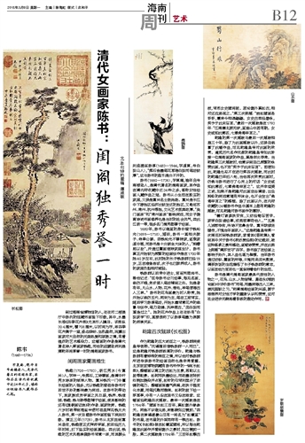 陈书是清代闺阁画家最具代表性的人物之一,花鸟、山水、人物皆精。秦祖永《桐阴论画》中评价陈书“用笔、用墨深得古人三昧,颇无脂粉之习。”明清闺阁绘画的兴盛,源于思想界对女性才学的重新认识和赞赏,这对社会进步无疑起着积极的推动作用。