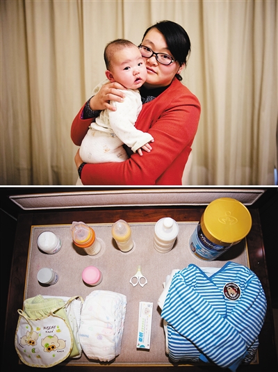 全国人大代表、江苏无锡市锡山区山联村党总支副书记朱虹带来了4个多月大的宝宝,她的主要“装备”是宝宝的用品(3月7日摄,拼版照片)。朱虹除了上会之外,每天早中晚夜间还要分四次给宝宝喂奶,会议期间由丈夫负责照看宝宝。 新华社记者 李响 摄