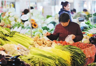 市民在石家庄市裕华区一农贸市场选购蔬菜。3月10日,国家统计局发布数据显示,2月份全国居民消费价格总水平同比上涨1.4%。新华社记者 朱旭东 摄