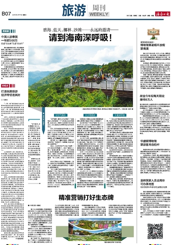 的确,刚刚上岛的游客,看到的是这里的阳光、大海和沙滩,随着旅程的深入,他们发现海南岛更有着神秘的热带雨林、清新的空气,一流的生态环境让全岛成为了一个大景区。