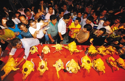 3月5日,正月十五元宵节,华灯初上之时,琼海市博鳌镇乐城岛上人声鼎沸,热闹非凡。各家各户的人们正忙着把自家的煮好肥鸡摆出门口,准备迎接评委。乐城岛的元宵节在琼海一带颇为著名,这里除了会举办一系列的琼剧、闹八音、游神等活动外,肥鸡赛也是其中一项极具特色的活动。
