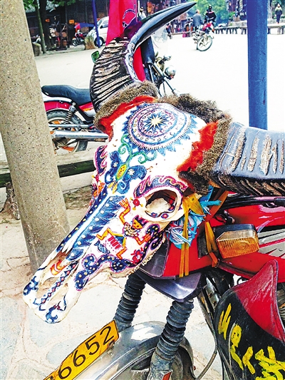 “这比小羊还棒吧!”指着摩托车,王苗仙自豪地说,确实,这是一头上好斗牛的头颅做成的,因为人缘好,他有幸得到这幅头骨,寨里的苗王家都没这么好的牛骨牛角呢。细细看,头骨上还专门找了民间大师画了辟邪的图腾,蓝色红色着笔细致,并用小松鼠的皮毛做的缝隙衔接,极富民族风又霸气十足。