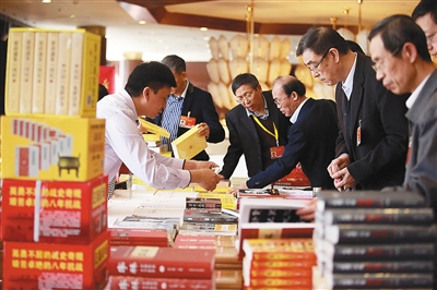 3月9日中午,北京国际饭店大堂,全国两会政协分组讨论的会场外,刚刚结束上午分组讨论的政协委员们,围聚在一起阅读购买书籍。