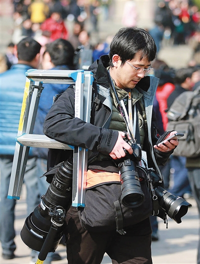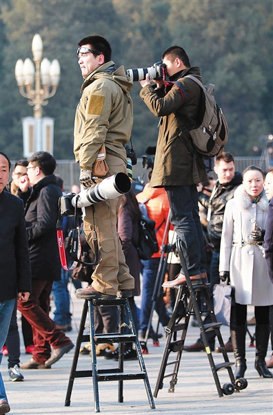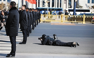 3月9日,全国两会如火如荼地进行,在这个聚集了3100多名中外媒体记者的同场竞技舞台上,各路记者的繁忙身影中出现了“比高”、“比低”、“比重”等有趣瞬间,其实比的都是各自的想法与角度。 本报特派记者 张杰 摄