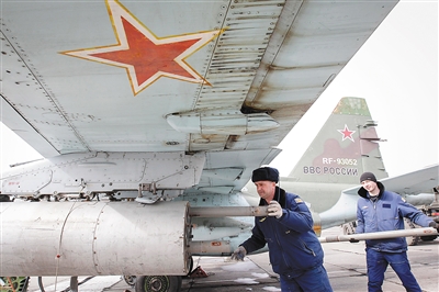 ➡ 3月12日,俄罗斯空军地勤人员为苏-25战斗机装填空地火箭弹。俄罗斯南部军区新闻处12日发表声明说,超过8000名士兵当天在南高加索、北高加索、克里米亚、南奥塞梯、阿布哈兹以及亚美尼亚等地参加实战演习。 新华社/路透