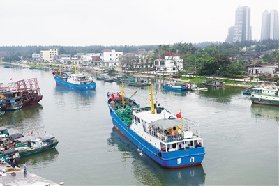 3月13日,琼海潭门港两艘500吨级钢质大渔船正徐徐驶离港口。 特约记者 蒙钟德 摄
