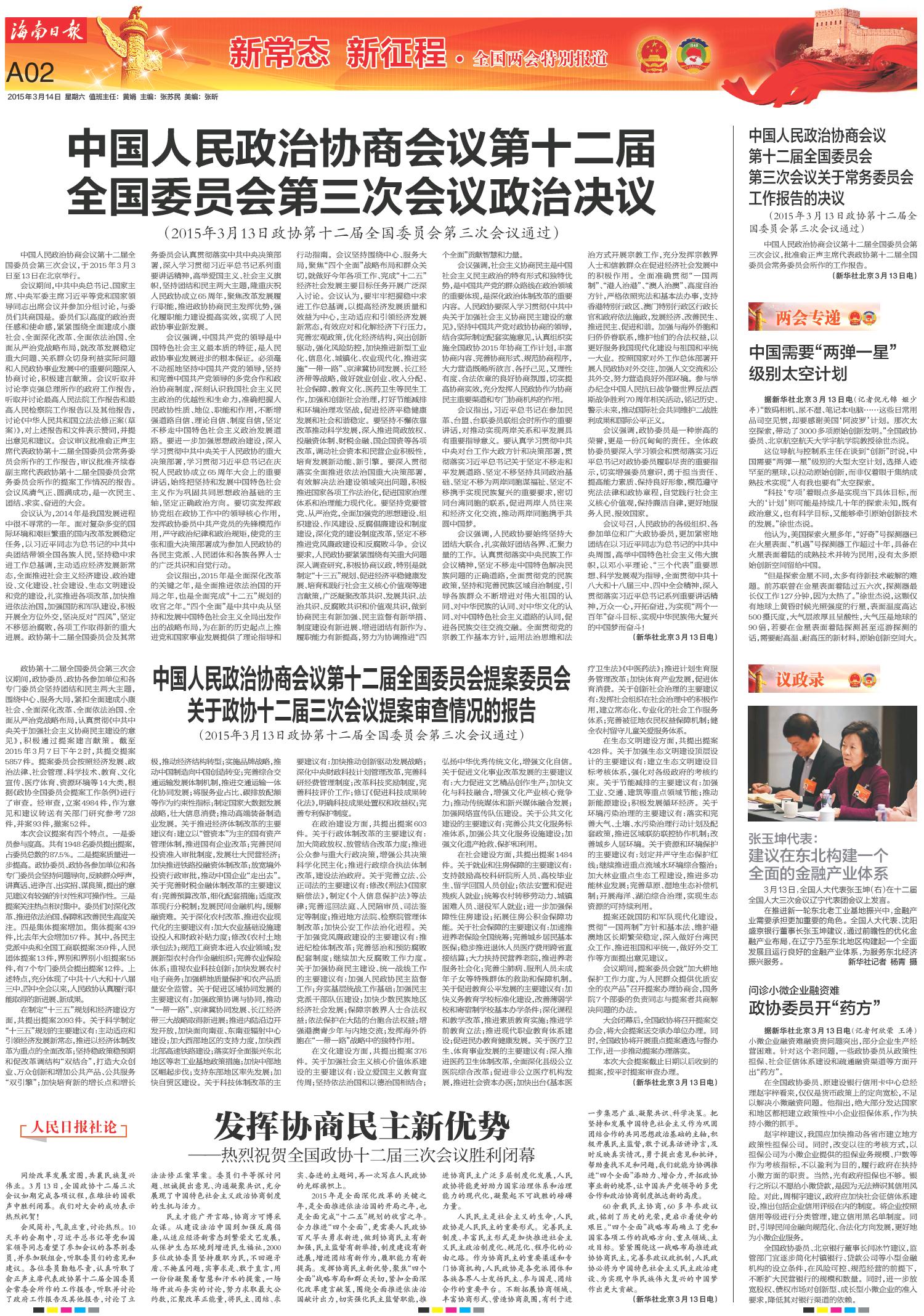中国人民政治协商会议第十二届 全国委员会第三次会议政治决议