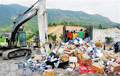 图为活动期间,该局将2014年度罚没的1.3万余件假冒伪劣商品进行填埋销毁。