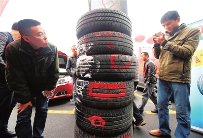 3月15日,杭州举办第四届“问题车展”,曝光20多个品牌100多辆“问题车”。图为现场展示存在起皮问题的轮胎。 新华社记者 韩传号 摄
