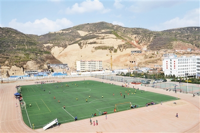 小学生们参加陕西省志丹县青少年校园足球联赛。