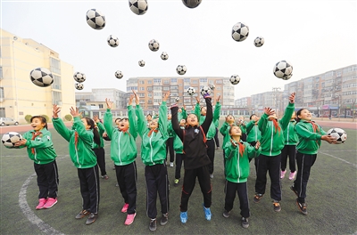 3月16日,天津市北辰区宜兴埠第三小学的学生在校园足球文化节上抛接足球。 本专栏图片均由新华社发