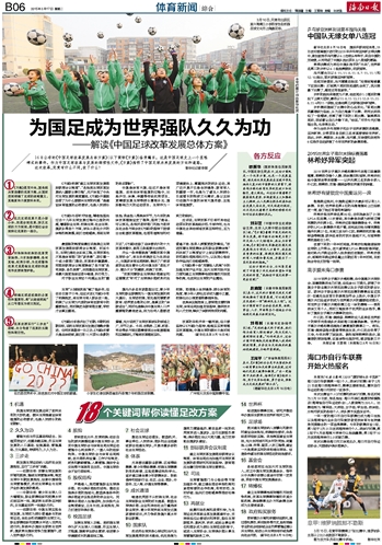 16日公布的《中国足球改革发展总体方案》(以下简称《方案》)备受瞩目。这是中国足球史上一个里程碑式的事件。作为中国足球改革与发展的纲领性文件,《方案》指明了中国足球未来发展的方向和道路。这次改革,究竟有什么不同,改了什么?
