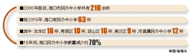 据海口市教育局提供的一组数据显示,2000年前后,海口市民办中小学共有210余所,到如今,仅有民办中小学63所,其中:龙华区16所,秀英区10所,琼山区16所,美兰区9所,市直属民办中小学12所。短短15年间,海口民办中小学数量减少了约70%。