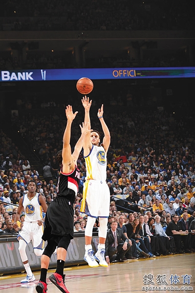 库里(右)在与开拓者队的比赛中投射三分球。 小新发