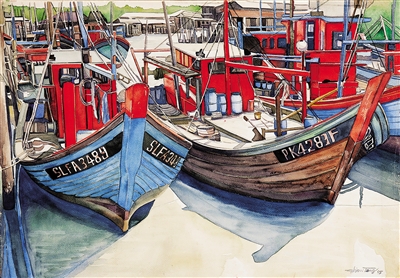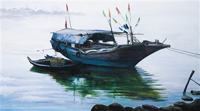 “马来西亚的华人画家,多以个人创作为主,没有形成一个统一的风格。”曾昭承介绍,在长期的自我探索过程中,他的油画作品自然而然的偏向于硬边派。例如,此次参展的《椰树下》、《海神庙》、《沉静的午后》等作品中,对于渔船、岩石、椰子树等景物的线条处理上,笔触较为突出、锋利,线条的错落感较强;在表现船体时以突出的线条,配以红色、蓝色、黄色等艳丽色彩,对比强烈,南洋风韵跃然纸上。