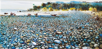 海南本土画家谢耀庭的《岁月》,整面沙滩上的粒粒石头刻画细腻,引人望向远方,沧桑岁月中见质朴灵动。画家王锐的作品则多聚焦于恬静安宁的田园风貌,颇有诗意葱茏、田园牧歌的意境,展现出当代人对于土地、家园、故乡等恒久梦想的质朴回归。画家周少灵的画作以画面生动、风格清新、富有激情见长,其画作《情动沧海》粗犷大气不失构思细腻,用礁石、海鸟、海浪构成的富有震撼力的画面。画家梁峰的《琼中早春》和《夏至》将水田、树木的细节以及光影的变化处理得丝丝入扣、耐人寻味,使得画作呈现出一派宁静致远、淡泊漂渺的韵味。画家陈奕文的《雨后》和《黄昏》两幅作品,将天色的变化作为重点,通过云与光的明暗对比,将光的律动恰到好处地捕捉到画面当中,活灵活现地展现了光影变迁。