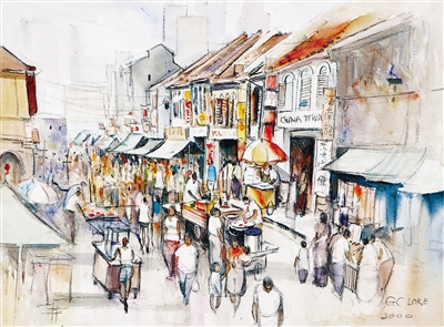 此外,马来西亚美术深受英国水彩画的影响。英国气候湿润,水彩画色彩鲜明,变化多端。细观参展画家陆宇坚的水彩画,能够寻到英国水彩画的影子。他的画作《东海岸小镇》和《吉隆坡唐人街》,画面中水分较多,在描绘市场中的建筑、人物多用多彩色调,南洋街上的生活气息尽显。
