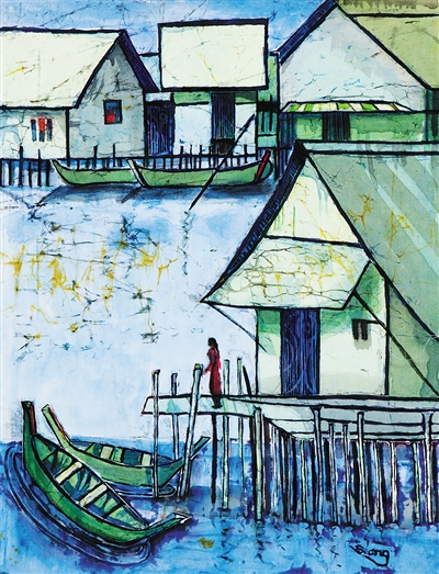展览中,马来西亚琼籍画家的作品以其鲜艳明亮的用色和纯朴闲逸的生活气息,吸引了众人的目光。